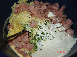 Separat se amesteca galbenusele cu 4 linguri de ulei. Se adauga iaurtul cascavalul ras pe razatoarea cu gauri mici, sunca taiata feliute si prazul calit. Se amesteca bine si se adauga faina si praful de copt..