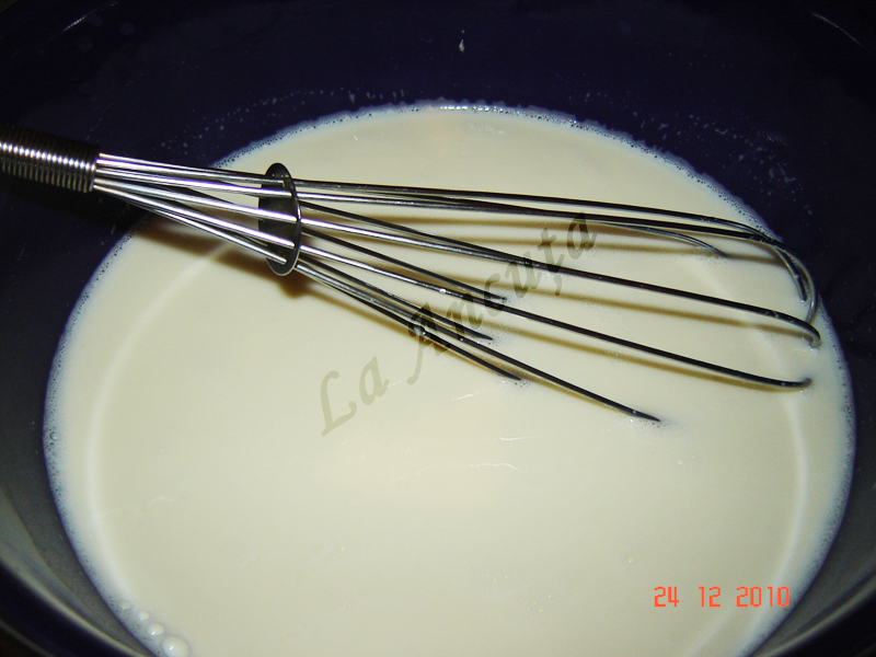 Intre timp facem crema. Amestecam 2 linguri de zahar cu amidonul si turnam treptat 100 ml lapte rece, amestecand bine, sa nu ramana cocoloase.