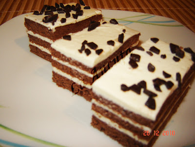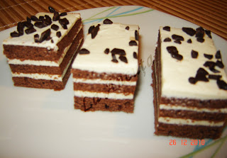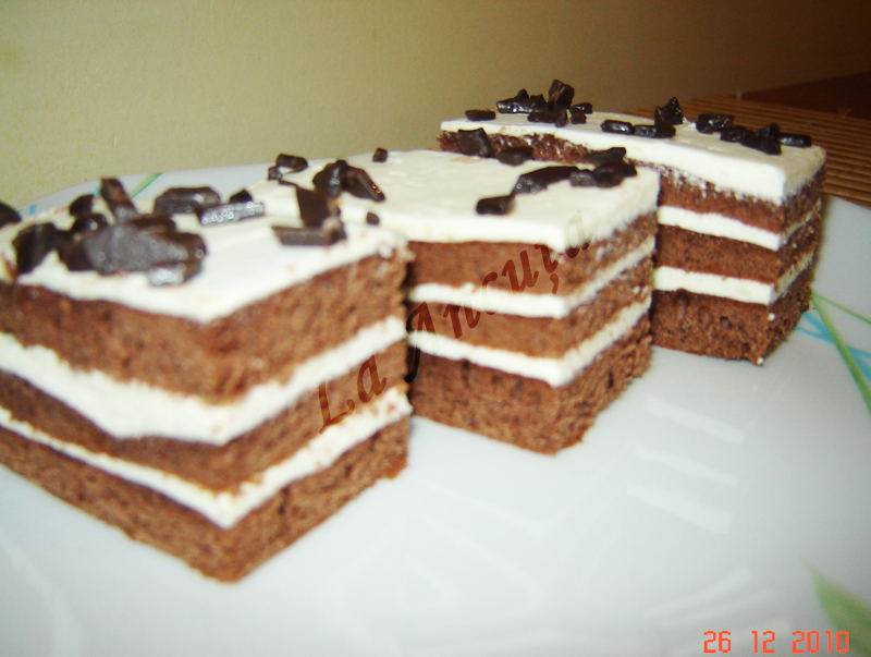 Crema se imparte in trei parti si se umplu cele trei blaturi insiropate putin cu sirop de zahar.