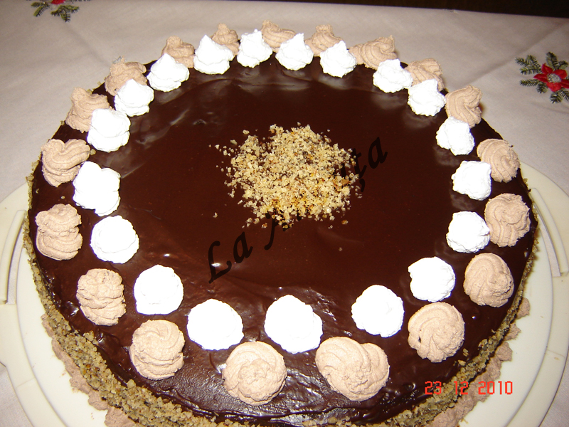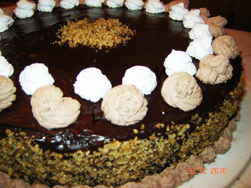 Eu am ornat marginea tortului cu nuca macinata si am dat la rece sa se intareasca. Apoi am ornat cu frisca si o lingura de crema amestecata cu frisca batuta.