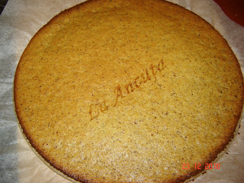 Coacem blatul in tava tapetata cu hartie de copt 15-20 de minute, pana se rumeneste usor pe mergini. Blatul va fi unul subtire.