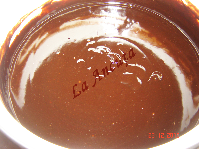 Ciocolata rupta bucatele se pune pe foc mic impreuna cu frisca si untul. Se amesteca pana se topeste ciocolata, fara sa fiarba.