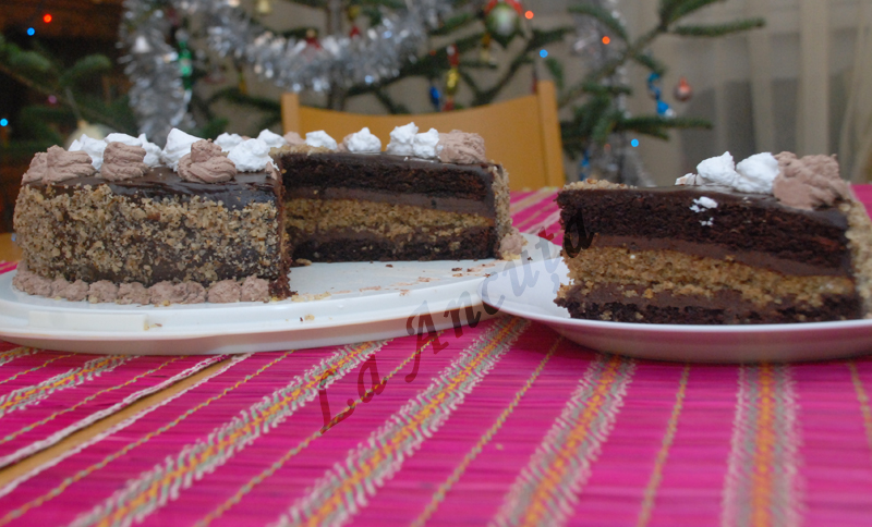 Se pune pe un platou un blat cu cacao, se insiropeaza putin si se acopera cu jumatate din crema. Punem blatul de nuca, putin insiropat si cealalta jumatate de crema (am pastrat o lingura de crema pentru ornat). Acoperim tortul cu al doilea blat de cacao insiropat si dam la rece.