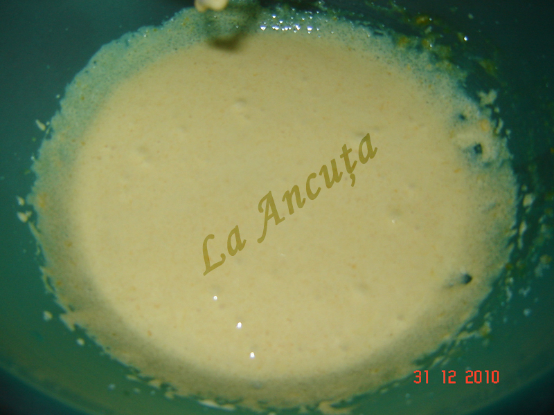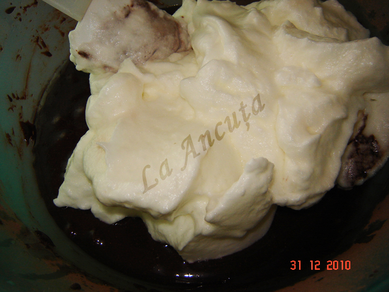 Amestecul format il adaugam in frisca batuta tare si amestecam pana se incorporeaza.