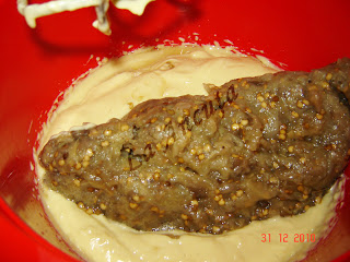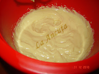 Amestecam galbenusul cu mustarul si incepem sa turnam ulei cate putin, amestecand continuu.