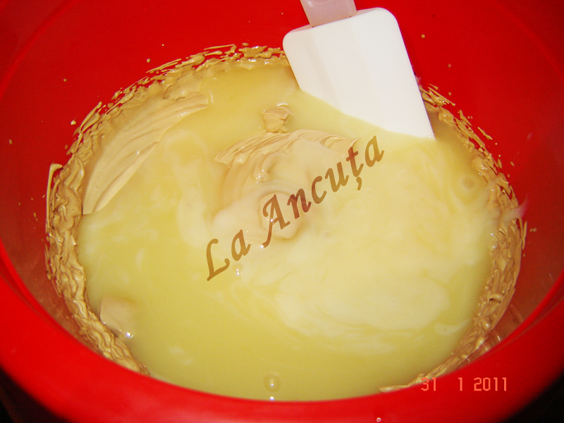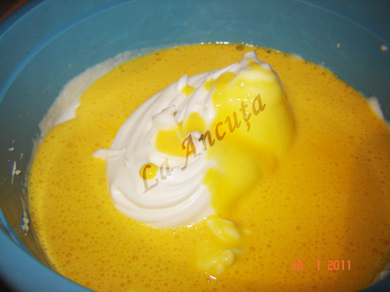Galbenusurile le amestecam bine cu uleiul si esenta de rom iar apoi le adaugam peste spuma de albusuri.