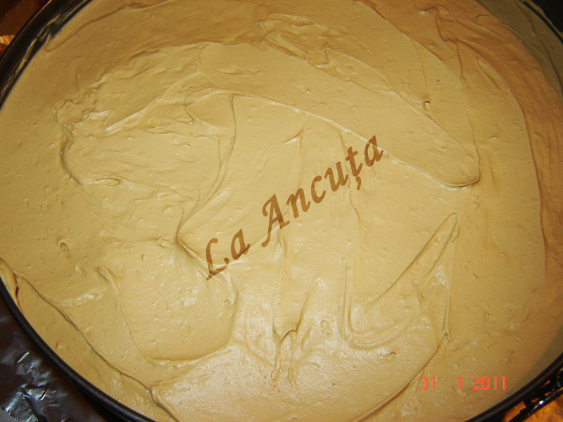 Peste blat punem crema de cafea si apoi celalalt blat de cacao insiropat.