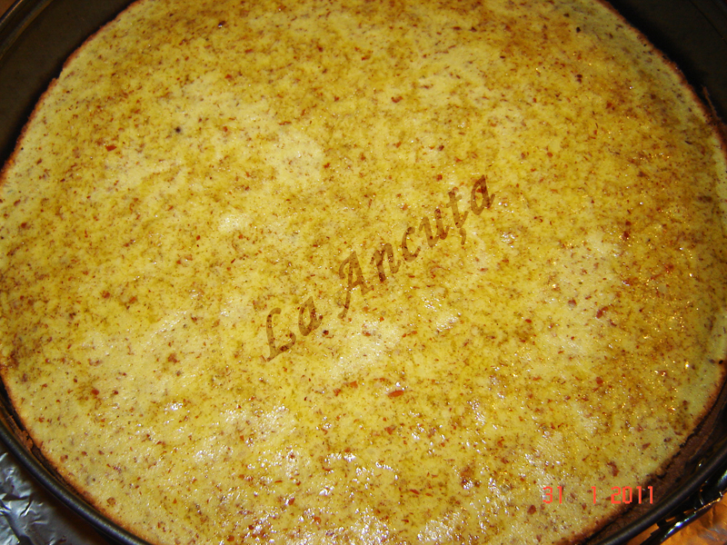 Turnam toata compozitia in tava rotunda (24 cm) tapetata cu hartie de copt.