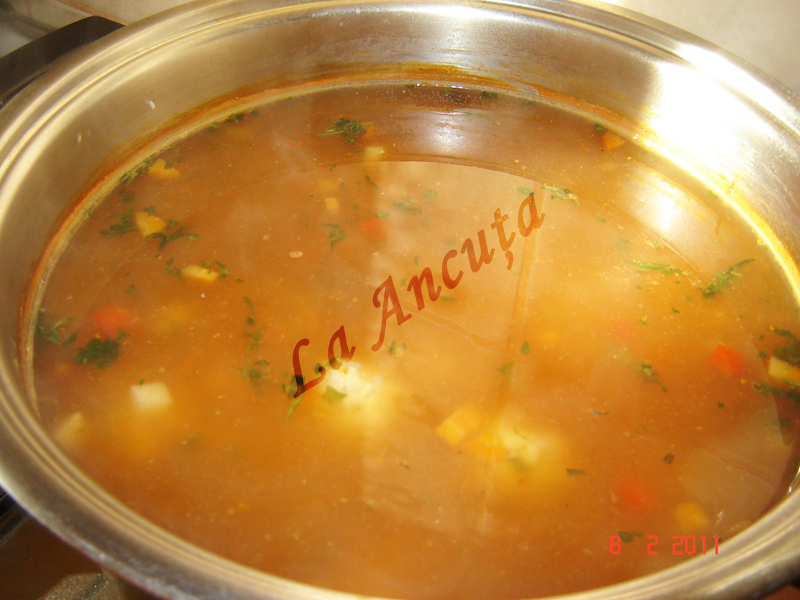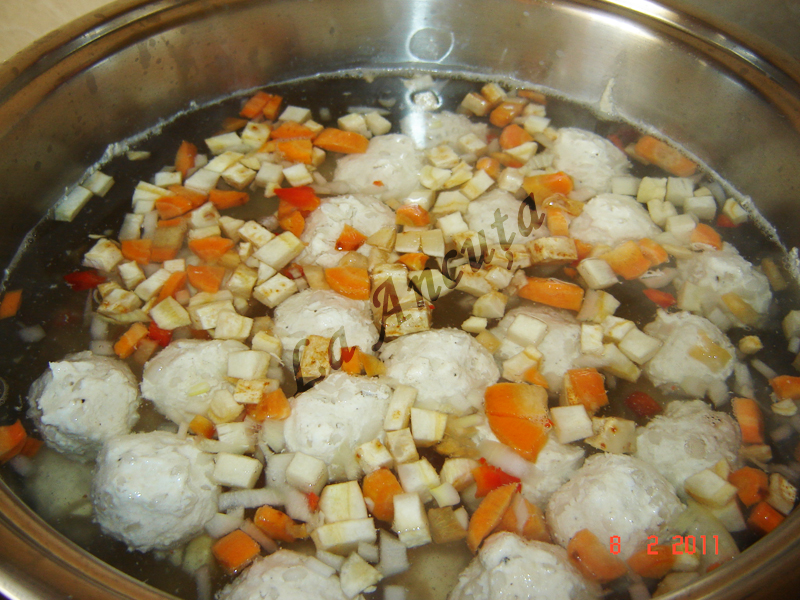 Cand s-au ridicat deasupra apei adaugam ceapa si celelalte legume taiate marunt.