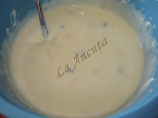 Pentru umplutura am mixat bine branza cu zahrarul, apoi am adaugat ouale si am mixat pana a devenit cremoasa. La final am adaugat aromele si stafidele.