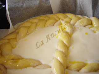Din aluatul ramas facem o impletitura ( eu am impletit in 5) pe care o punem usor de jur imprejurul tavii.