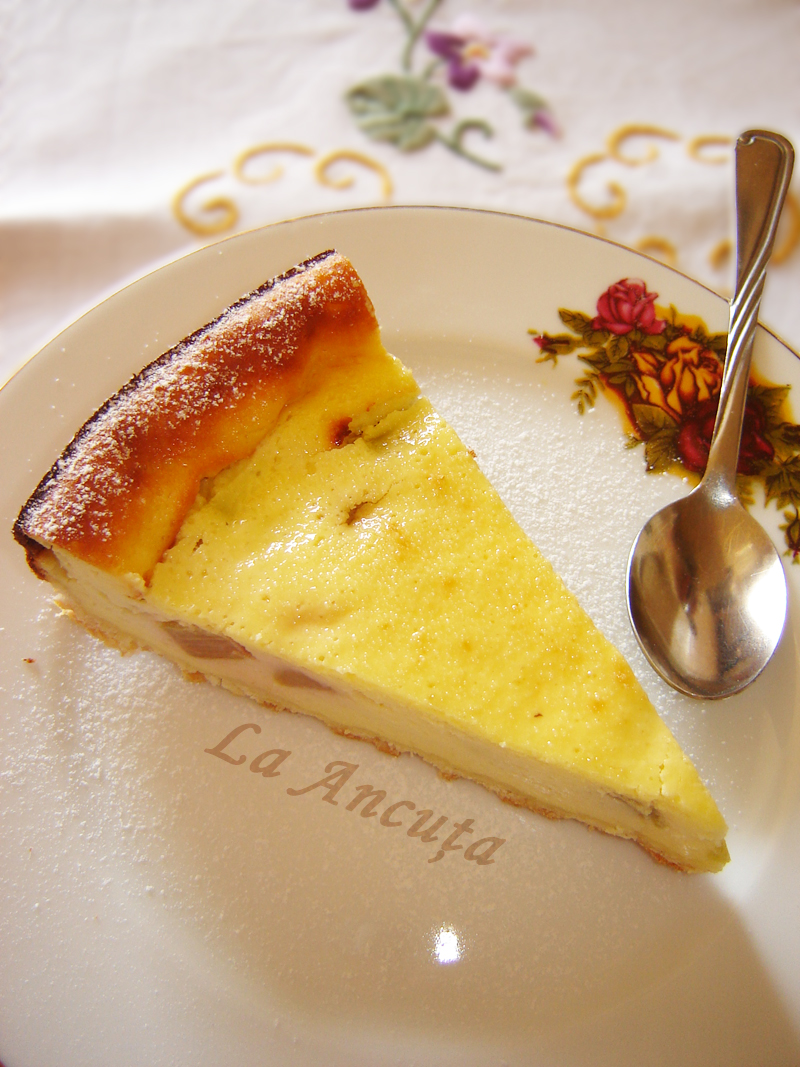 Mixam bine branza de vaci cu zaharul si vanilia iar apoi adaugam laptele batut si ouale. Amestecam pana se omogenizeaza.