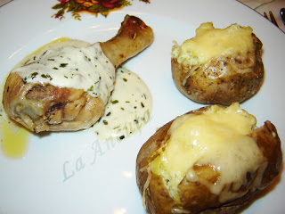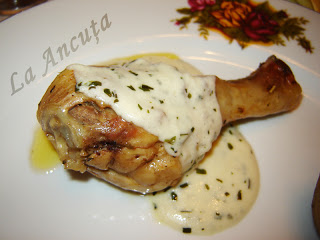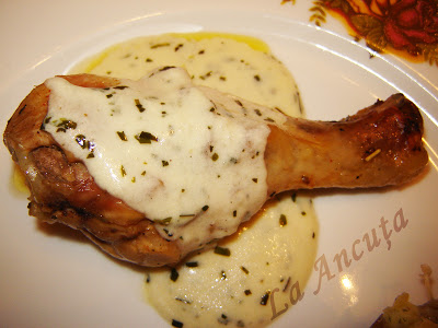 Servim sosul cald cu pulpele de pui rumenite. Noi am avut o garnitura de cartofi copti umpluti cu branza.