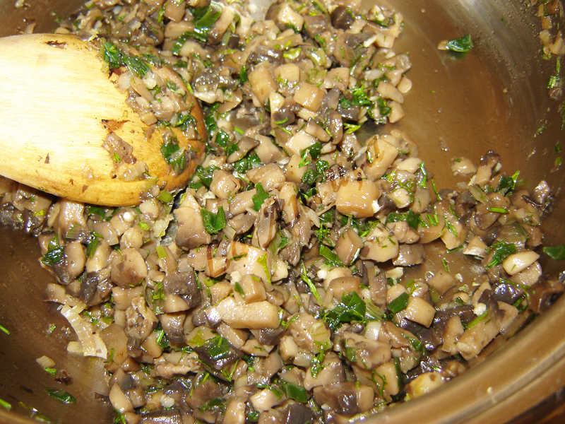 Taiem ceapa marunt si o punem la sotat in 3 linguri ulei de masline si 3 linguri apa. Adaugam apoi ciupercile taiate marunt si lasam sa fiarba pana scade tot lichidul. Potrivim de sare si piper si adaugam cimbrul. Dupa ce a scazut toata zeama stingem focul si adaugam patrunjel verde tocat.