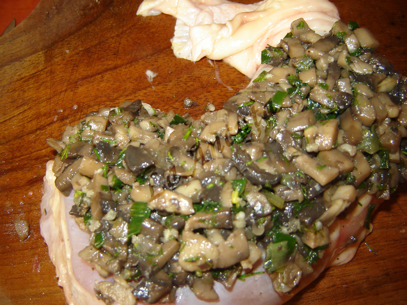 Punem umplutura de ciuperci, usor, pe fiecare pulpa iar apoi tragem pielea la loc si presaram putina boia.