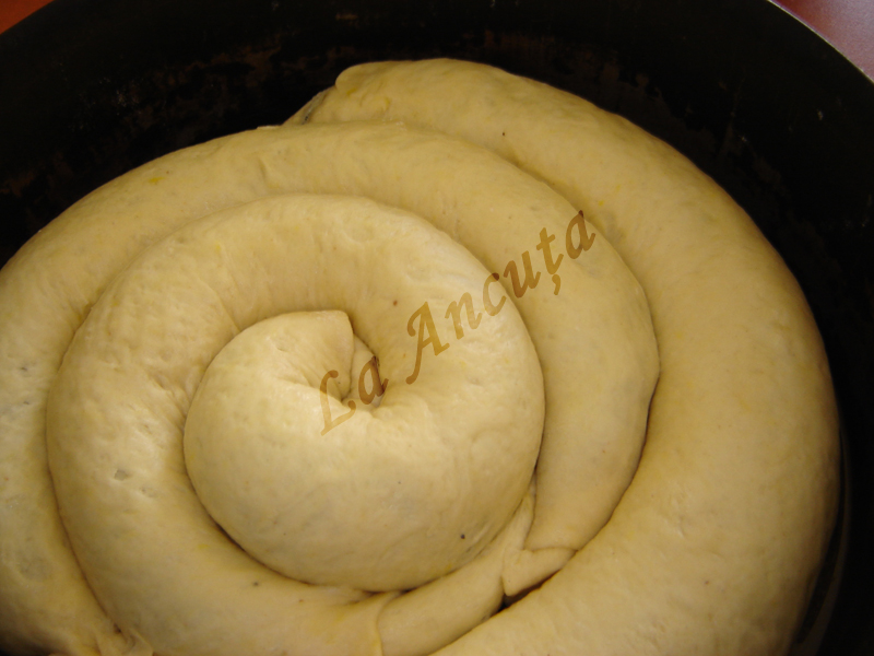 Din primul sul formam o sirala pe care o punem in mijlocul tavii. Continuam cu celelalte doua suluri de aluat, pana umplem tava. (nu stiu cat de bine am reusit sa explic). La final in tava trebuie sa aveti un “melc” destul de mare :).