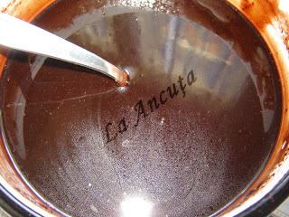 Punem intr-un vas, la foc mic zaharul impreuna cu cacaoa, laptele si untul. Amestecam pana se omogenizeaza. Dam de pe foc si adaugam esenta de rom.