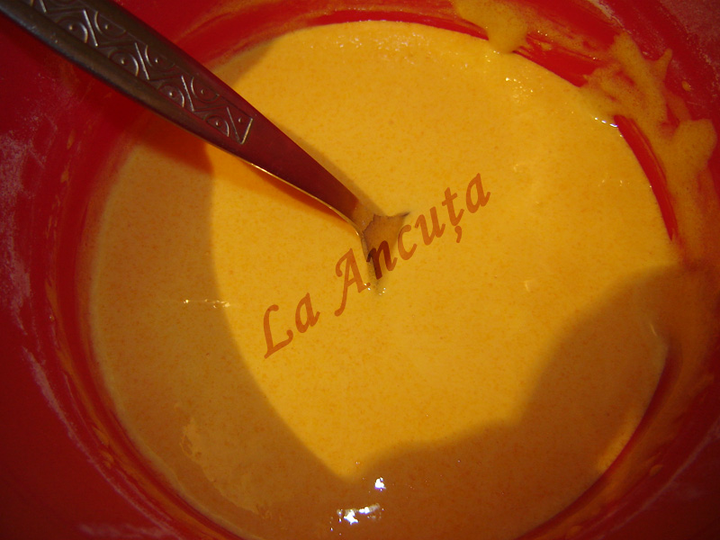 Mixam bine untul moale cu zaharul pana devine spuma.