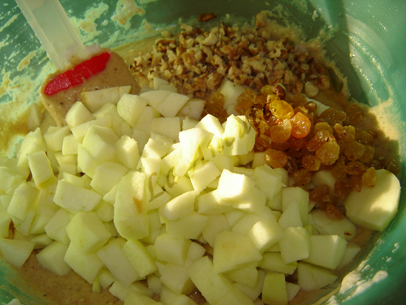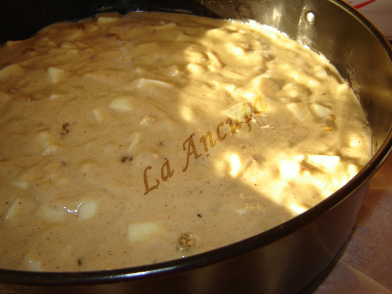 Curatam merele de coaja si samburi si le taiem cubulete. Adaugam merele taiate, miezul de nuca si stafidele (cu tot cu coniac) si amestecam usor pana se incorporeaza.