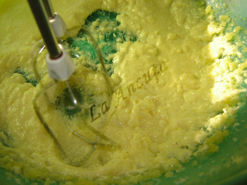 Mixam galbenusurile cu zaharul pana se albesc. Adaugam untul moale si vanilia si mixam pana se incorporeaza.