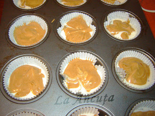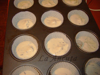 Punem cate o lingura din aluatul cu vanilie in formele pentru briose.