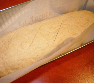 Dupa ce a dospit rasturnam aluatul pe blatul de lucru si framantam putin, pentru a scoate aerul. Dam aluatului o forma lunguiata si il asezam in tava tapetata cu hartie de copt. Crestam cu un cutin foarte ascutit si lasam la crescut inca 15-20 de minute.