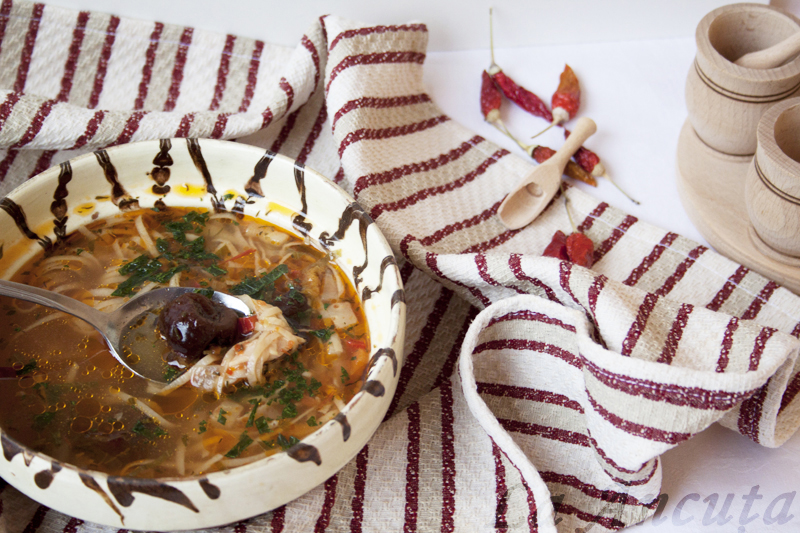 Servim ciorba calda, cu paine proaspata si ardei iute.