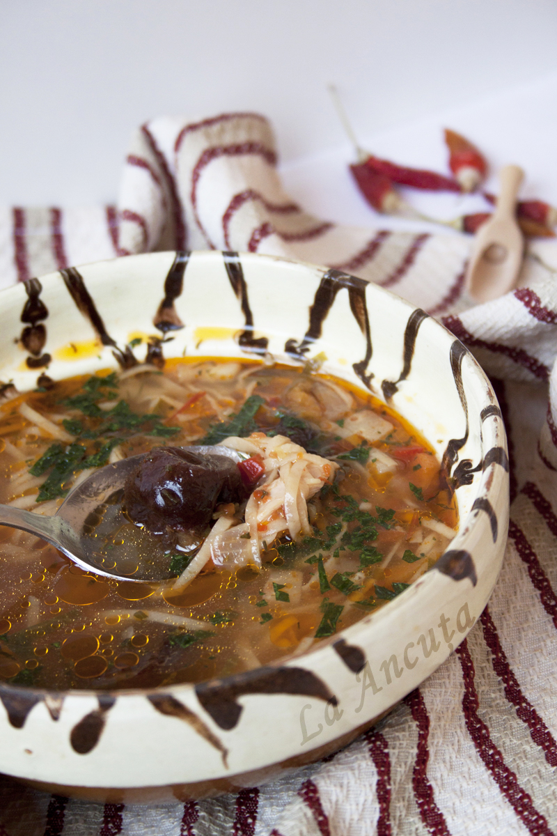 Poate o sa vi se para ciudata aceasta combinatie. Mie imi aduce aminte de copilarie, de iernile geroase cand bunica pregatea aceasta ciorba gustoasa. Va recomand sa o incercati, pentru ca e tare buna.