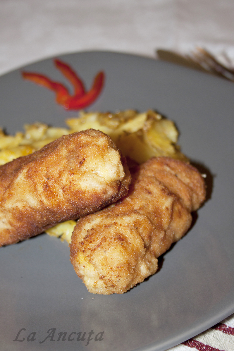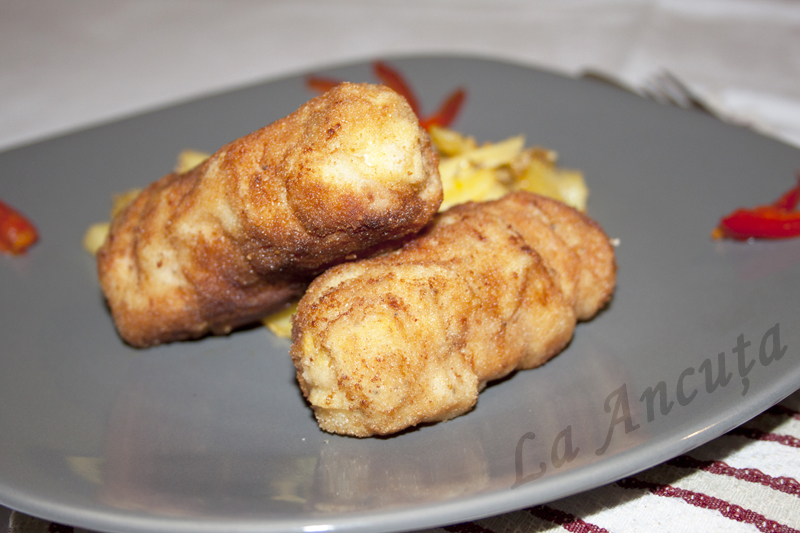 Trecem rulourile prin faina apoi prin ou si pesmet si le prajim in uleiul incins, pe toate partile. Scoatem rulourile pe hartie absorbanta pentru a scapa de grasimea in exces.