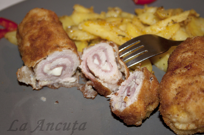 Pe fiecare felie de carne asezam o felie de sunca (taiata subtire) si 2-3 bucatele de cascaval. Rulam strans avand grija sa intoarcem marginile in interior (ca la sarmale).