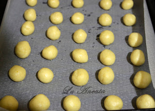 Rupem bucatele din aluat si formam bilute pe care le asezam in tava tapetata cu hartie de copt.