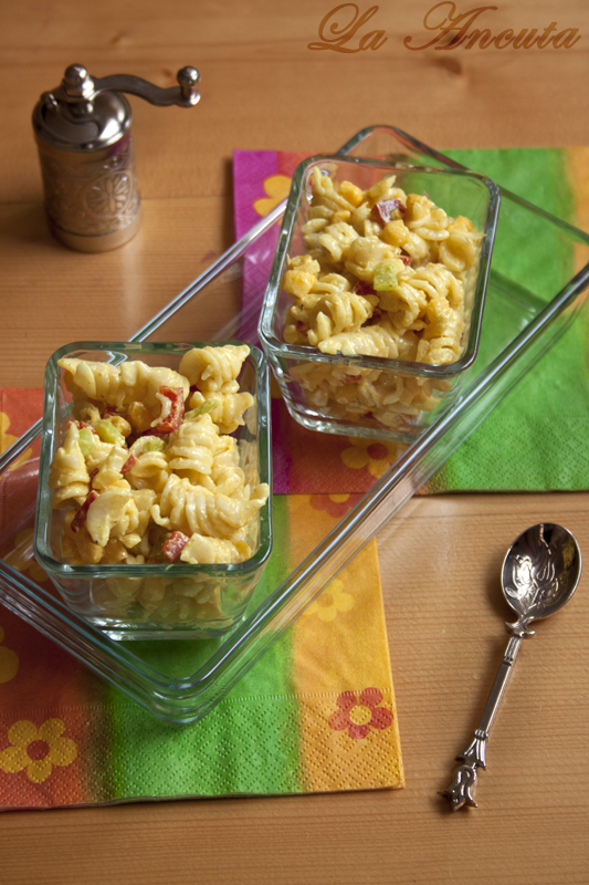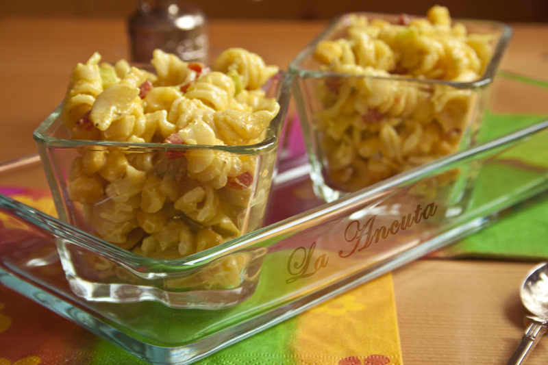 Amestecam toate ingredientele peste care adaugam sosul de maioneza. Potrivim de sare si piper si amestecam pana se omogenizeaza.