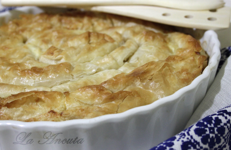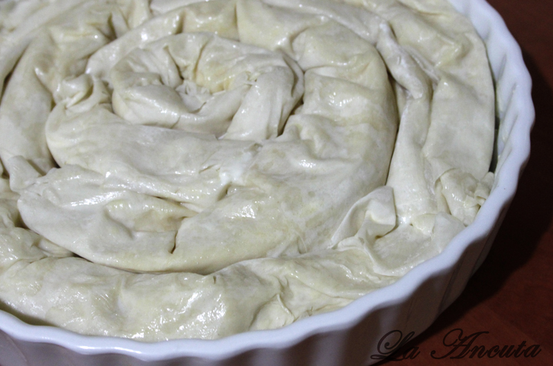 Dezghetam foile de placinta. Intindem o foaie pe care o ungem cu unt topit. Asezam a foua foaia pe care o ungem cu unt si acoperim cu cea de-a treia foaie. Punem umplutura pe latura lunga si rulam. Ruloul astfel foemat il invartim in forma de spirala si il asezam in mijlocul tavii unse cu unt. La fel procedam si cu urmatoarele foi pe care o sa le asezam in continuarea spiralei, pana epuizam foile si umplutura.