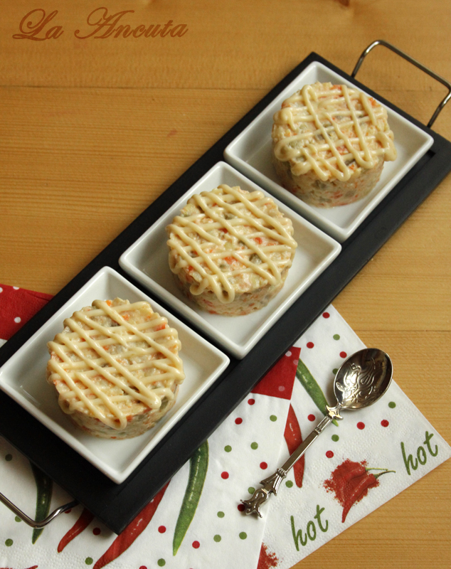 Adaugam apoi maioneaza (preparata dupa reteta preferata a fiecaruia) si amestecam pana se omogenizeaza.