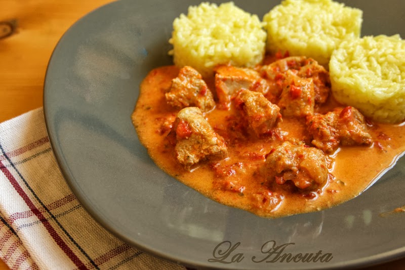Se serveste calda alaturi de garnitura preferata. Noi am avut orez cu curry.