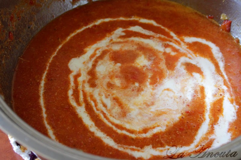 Dam cratita de pe foc si cu o spumiera scoatem intr-o farfurie carnea si jumatate din ardei. Restul ardeilor ii pasiram cu mixerul vertical.. Adaugam smantana iar apoi punem carnea si ardeii inapoi in cratita si mai lasam sa fiarba la foc mic 5 minute. Potrivim de sare si oprim focul.