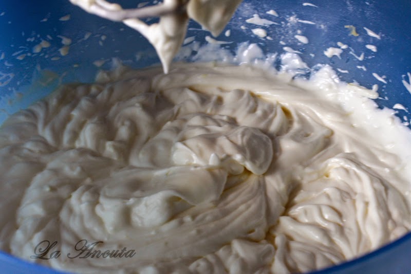 Cremele le vom pregati in acelasi timp. Intr-un bol mixam untul si zaharul pentru crema de branza iar in alt bol untul si zaharul pentru crema de oua.