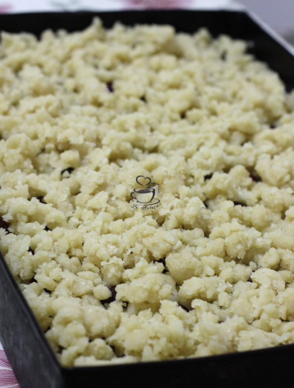 Pentru crumble amestecam faina cu zaharul iar apoi adugam untul topit si amestecam bine pana cand compozitia are consistenta nisipului ud. Presaram compozitia pe toata suprafata prajiturii.