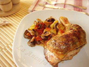 Ingrediente: 2 pulpe de pui intregi 300- 400 g ciuperci proaspete 1 ceapa verde 4 cartifi 1/2 cutie rosii decojite...