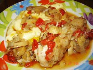 Ingrediente: 4 pulpe 200 g ciuperci 2 cepe potrivite 2 rosii 100 ml vin alb 2 catei de usturoi ulei...