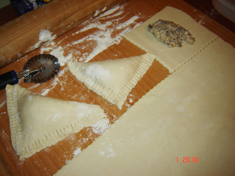 Se taie patratele si se pune in mijlocul fiecarui patrat cate o lingura de umplutura. Eu am umplut cateva cu ciuperci (am mai avut umplutura de la galustele de mamaliga).
