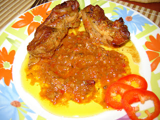 Amestecam bulionul cu pasta de ardei, cimbrul si apa si le punem peste carne.