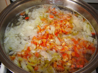 Ceapa si ardeiul se taie marunt si se adauga peste carne. Se lasa sa fiarba apoi se adauga rosia taiata.