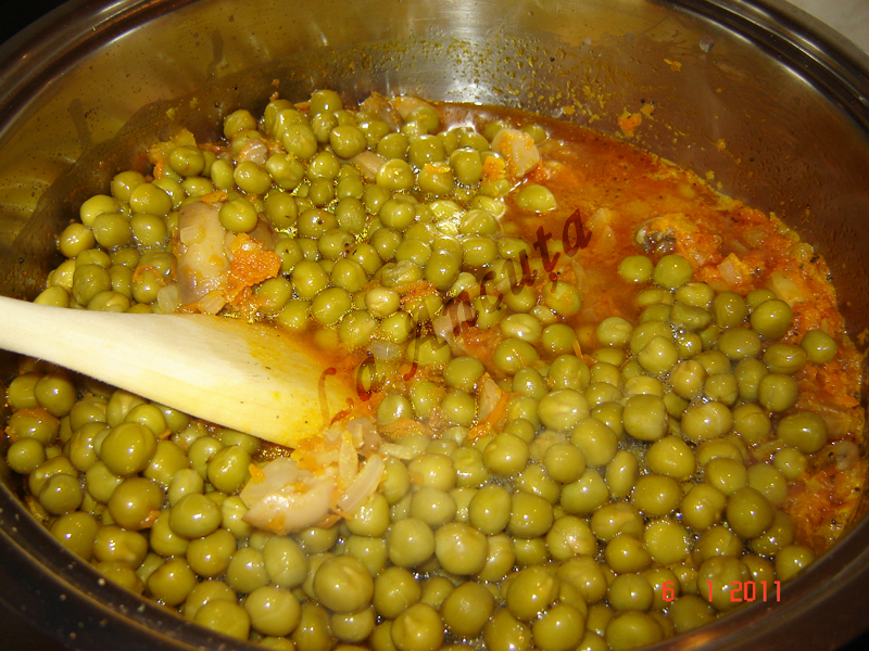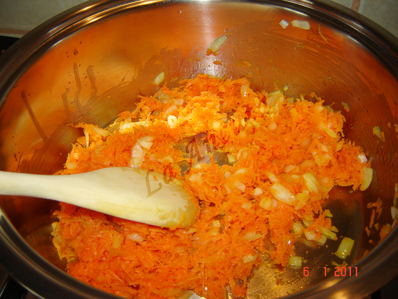 Intr-o cratita punem putin ulei si punem ceapa la calit. Dupa ce s-a inmuiat putin adaugam morcovul si mai lasam putin pe foc amestecand.