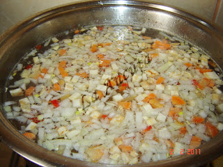 Curatam ceapa si o tocam marunt, la fel restul legumelor. Punem legumele la fiert in supa in care am fiert carnea.