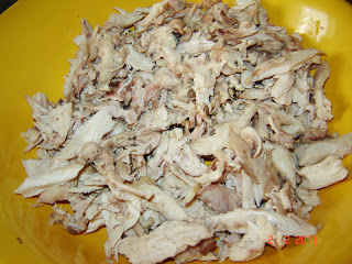Carnea de spala si se pune la fiert in apa cu sare. Spumam de cate ori este nevoie. Dupa ce a fiert scoatem carnea si o lasam putin sa se raceasca. Desfacem carnea de pe oase si o taiem fasii.