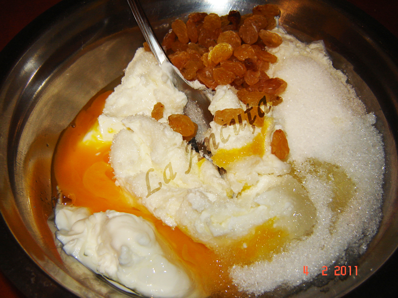 Branza de vaci o mixam cu un ou intreg, 1 plic de vanilie 50 g zahar.
