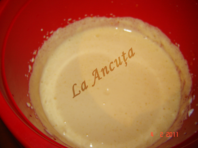 Galbenusurile le mixam cu 1 plic de vanilie si 80 g zahar. Adaugam apoi smantana si omogenizam.
