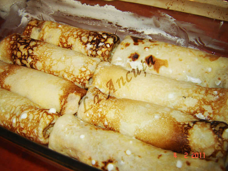 Umplem clatitele cu crema de branza, pliind marginile, ca sa nu iasa crema.