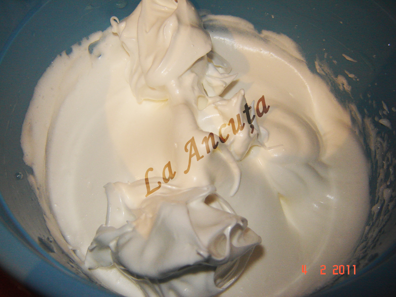 Intre timp batem albusurile spuma, cu un praf de sare. Adaugam apoi 120 g zahar si mixam pana devine lucioasa si zaharul s-a topit.